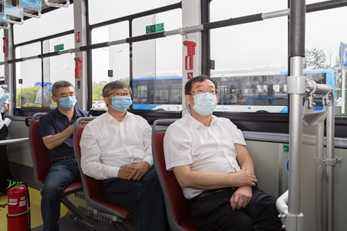 隨后,一行人登上公交車,總經(jīng)理劉東占對新能源公交車的上線運營情況,充電站建設(shè)情況,新車電池續(xù)航里程、安全性等方面做了介紹。
